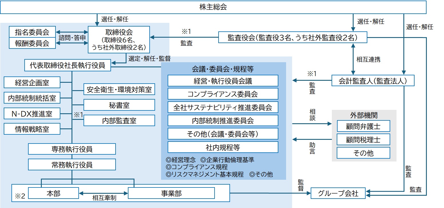 ネツレンでは、「株主、顧客、従業員、調達先、地域社会などとの調和および共生を通じた企業価値の向上」を図るため、コーポレート・ガバナンスを「経営の透明性、公正性を確保する最重要な経営機能」の一つと位置付けています。このような認識のもと、将来に向けて当社が持続的に成長する会社となることを目指し、経営における意思決定の迅速化、効率化に注力するとともに、業務執行に対する監督機能強化のための体制を整備していきます。
